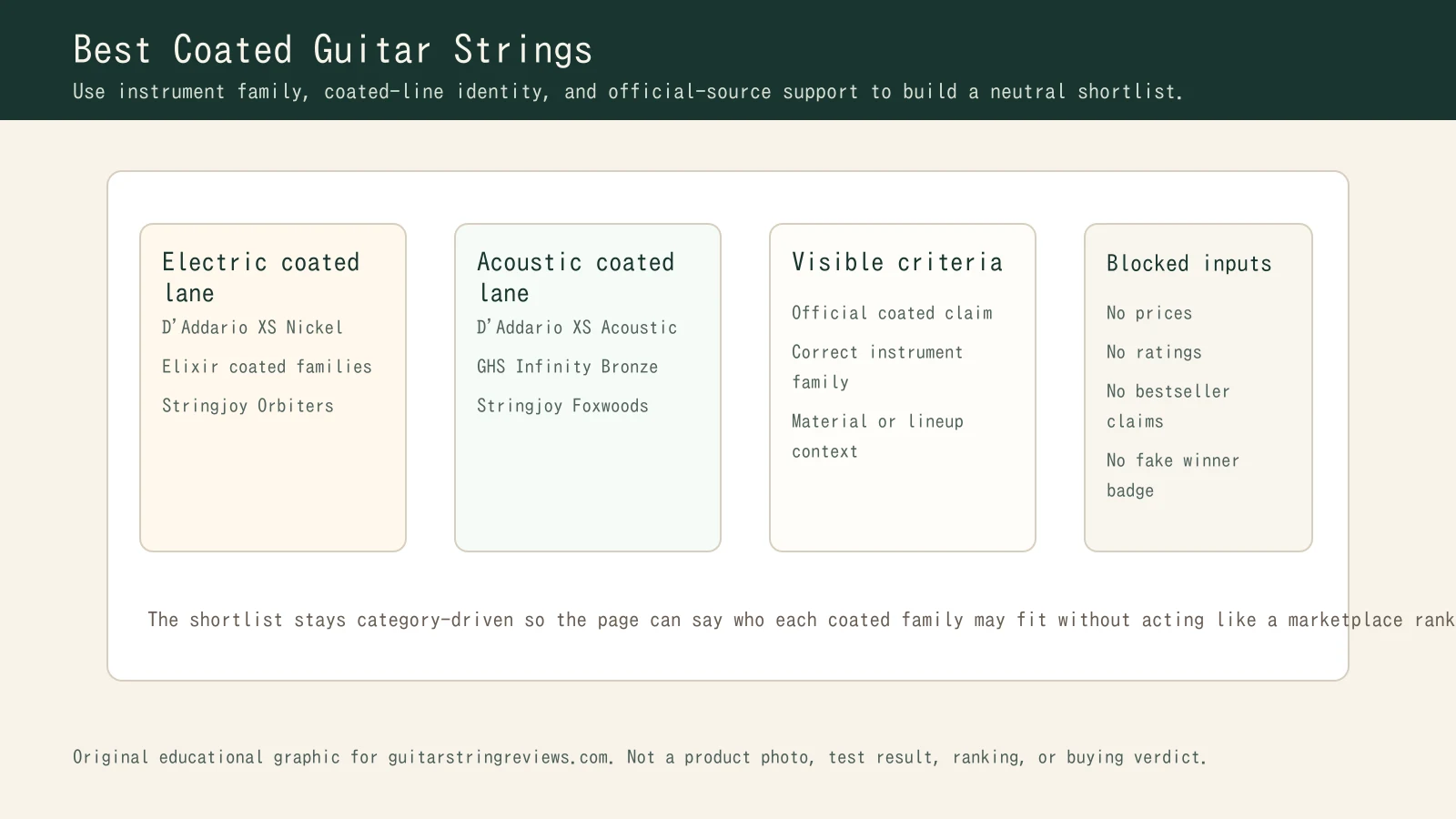That matters because coated-string shopping gets muddy fast. Some brands sell clearly coated lines, while others use treated or corrosion-resistant language that is not always the same thing. This guide keeps the comparison focused on string families that are presented as coated guitar strings by the manufacturer, then separates them by electric and acoustic use.